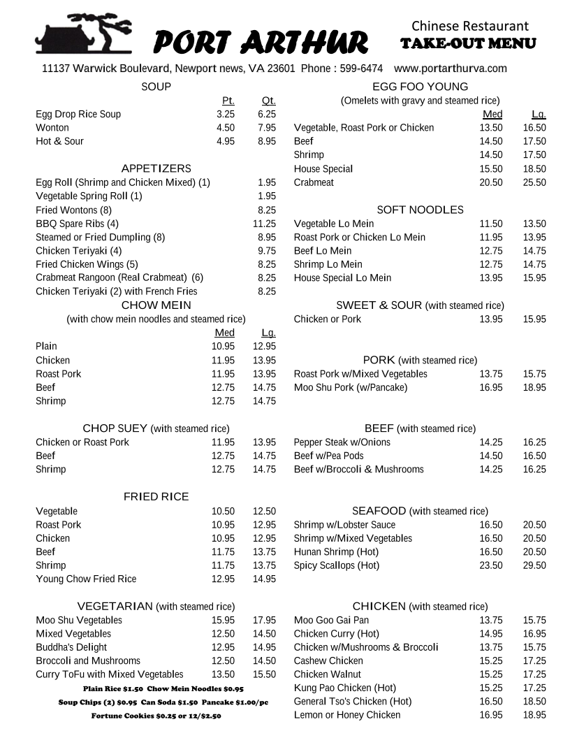 Conveniently located at 11137 Warwick Blvd, Port Arthur has cultivated a reputation for its delicious offerings, notably its renowned cow mein and savory wonton soup. Customers rave about the hearty flavors and generous portions, making it a go-to spot for both casual meals and special occasions.